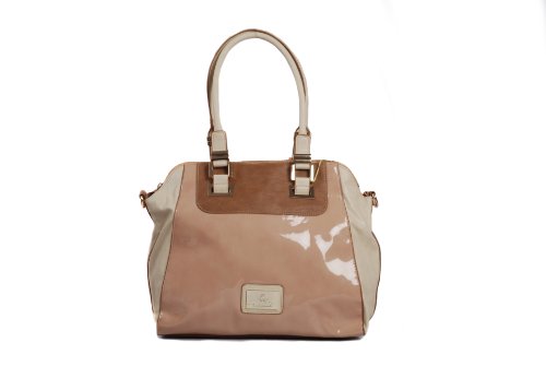 Beige and tan nude patent large handheld handbag with coloured panels by Juno Product Description