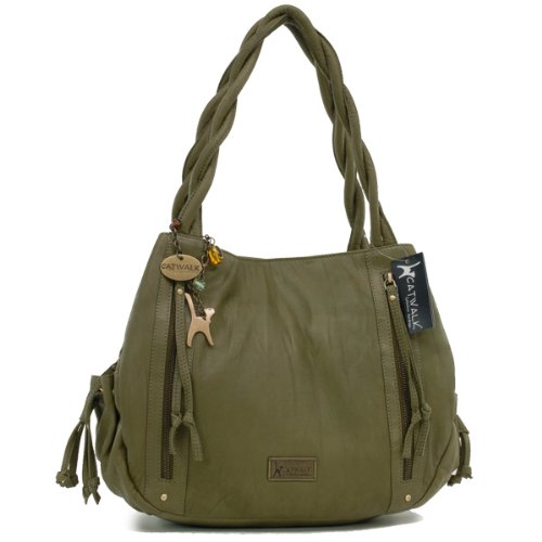 Description: This is not just ordinary leather, this is Catwalk Collection leather; gorgeously soft squashy washed matte leather with fashionable designer creases. Designed to be worn on the shoulder and hugged into the body and with strong, secure antique-brass metal zip fastening, the Caz tote bag is also very street-wise. The main compartment is wonderfully spacious and can comfortably hold magazines, diaries, make-up and paperwork up to A5 size, plus a lot more besides. The bag has that gorgeous new leather aroma only associated with high quality. This is a big bag; if you like to carry lots of stuff around, this tote bag will be just perfect for you! Double twisted leather handles allow for a generous fit over-the-shoulder. There are plenty of compartments and pockets to organise contents and the bag opens wide for easy access. The central compartment fastens with a zip and the two sides snap together over the top with a magnetic snap for added security. For ease of transport and to lessen the effects on the environment, this item will come flat-packed. Cat Logo Bag Charm included. The base of the bag is flat.