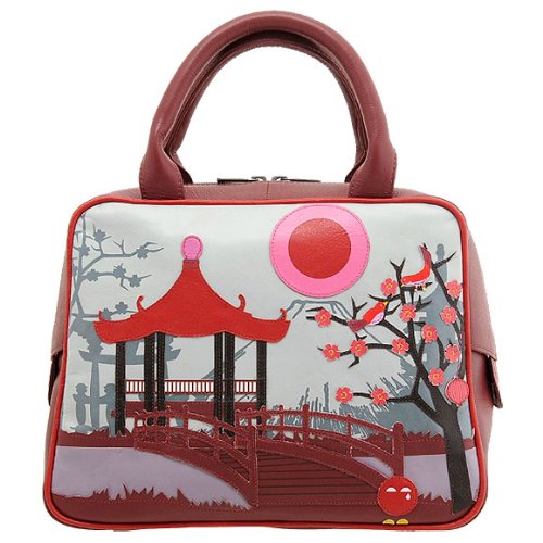 This Japanese-themed bag is really pretty, the burgundy and blue-grey colours that make up the bulk of the palette involved in the design of this bag convey a rather autumn/winter feel. The colours in real life are a little darker than in the (presumable extremely well-lit) product photo and the leather is a matte-finish rather than the shiny, almost-patent look suggested by the sheen on the sky sections in the photo. The extremely soft leather feels nice to touch and on arrival definitely smells the part. However, despite the structured design, this is a soft-sided bag and as a result the collage-style picture on the front of the bag shows significant puckers and tends to distort while in use.