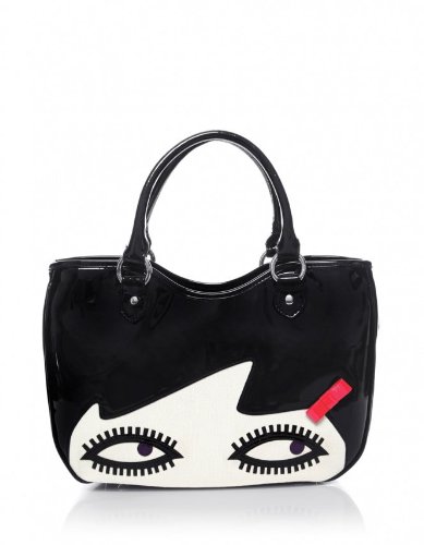 Description: Make a unique style statement this season with the Wanda Doll Face bag from exciting British fashion designer Lulu Guinness. The front of the women's bag features a pair of applique patent doll eyes with a red bow in her hair, while on the reverse her eyes are closed. With two top handles and a removable shoulder strap, the bag is as versatile as it is cute. The interior features a zip pocket and a pouch for your mobile phone and a funky stripe lining. Silver branded hardware features throughout. This quirky and kitsch bag will be the centre of attention and will instantly add fun and personality to any outfit. Perfect for day or night, the Lulu Guinness bag is fresh, charming and one-of-a-kind.
