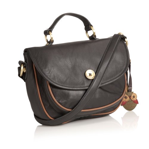 Description: Styled in soft leather with tan piped trims, this black across body bag from Mantaray has a flapover front with a grab handle to the top. This medium sized bag has an animal and floral patterned lining with three pockets and an adjustable strap.