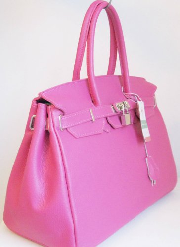 Pink Italian Leather Birkin Inspired Handbag With Silver Coloured Trims Hardware by Handbag Bliss! (Bright Pink) Product Description