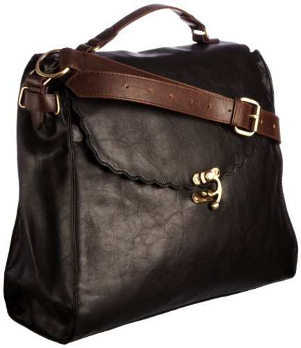Description: SATCHEL BAG MADE IN CLASSIC BLACK VINTAGE-WORN FINISH PU WITH DUAL HANDLE FUNCTION OF A TOP GRAB HANDLE AND ADJUSTABLE ACROSS BODY STRAP ATTACHED WITH BEAUTIFUL AND UNIQUE BRANDED FITTINGS. THE FLAP IS IN CONTRAST CHOC COLOUR VINTAGE-WORN FINISH PU AND HAS A SCALLOPED EDGE FINISH AND VINTAGE STYLE BRANDED LOCK CLOSURE. INNER HAS 'RED OR DEAD' EMBOSSED ZIP FACING AND MOBILE PHONE POCKET WITH BRANDED SPOT CHECK PRINT LINING.