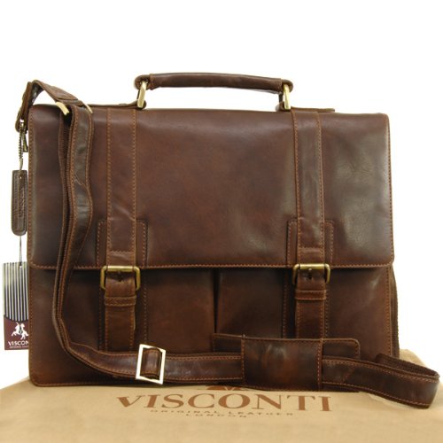 Description: Vintage vegetable tan brown leather has that dark and sultry look about it. This Visconti product is made from the finest leather and has that wonderful new leather aroma. Leather items may have wrinkles, scars, scratches that are inherent characteristics and natural beauty of the hide. This is strong, high quality leather and with its smooth polished surface and distressed antique finish, there's no doubt that this briefcase has plenty of attitude. If you covet the look of old, comfortably worn-in leather you won't have to wait the years it takes for the look to develop naturally as the leather has been specially prepared so that it takes on that much coveted, vintage effect much more quickly. The surface is designed to scratch easily but these marks will gently blend in over time adding to the unique character of the bag. The long adjustable strap enables the bag to be worn either over-the-shoulder or hands-free across-the-body. Each product comes with its own Visconti dust bag. This is a big bag with good capacity and will comfortably accommodate A4 sized note books, files and document wallets. The long adjustable strap is made from leather topped hardwearing polyester and has a sliding rubber shoulder grip for comfort when carrying heavy loads. The interior of the bag is fully lined and the main flap is luxuriously lined with suede. There are plenty of compartments and pockets to organise contents.