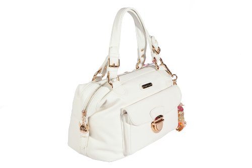 wanted a pure white bowling bag.... not too big, but not too tiny and this was it! its stunning. from the leather brilliant white exterior to the bright pink inner lining!. love the jangling key charms too (which are multi coloured beading, can be detached). the zip pulls are gold heart shaped and have the cc initials. several inner pockets for mobiles and bits. one front button shut pocket, which i thought may stick out too much, but doesnt. and a zip shut back pocket. well worth the price. if there is any criticism its that the main zip is a little stiff, but with constant use, its easily fixed. i luv it, so on trend! colour and style!