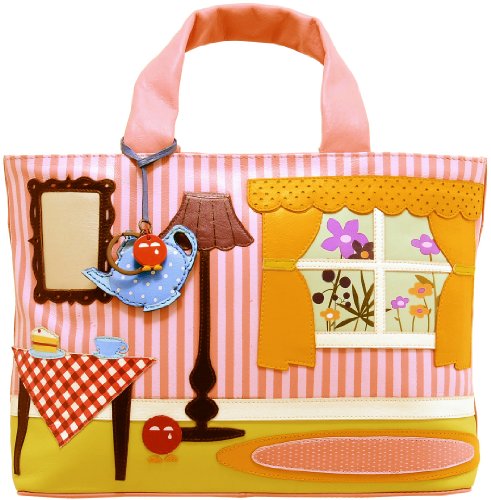 The leather the bag is made from is soft and pleasant to touch. There's a flat base, allowing the bag to stand upright. The picture on the front is a combination of appliqued pieces and printed designs on leather. In the flesh, the colours are rather less yellow than they appear in the product photos. The reverse side of the bag is a solid pink leather (the same shade as the handles) and there's an applique picture of a cake with a piece missing from it - perhaps the piece that appears on the table at the front.